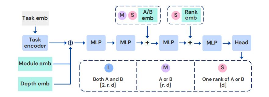 按模块类型(而非具体层)共享输出空间。对于同一类型的模块,超网络仅生成一组共享的LoRA矩阵,并应用于该类型下的所有层。