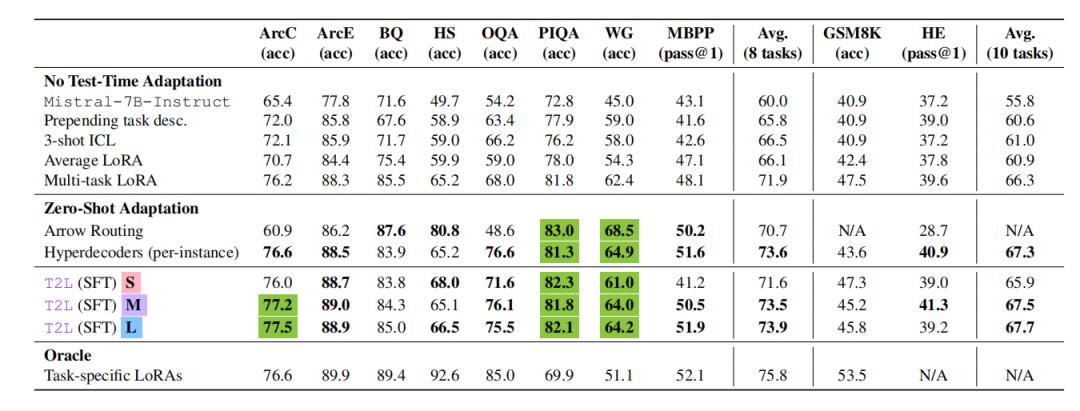 结果表明,T2L的平均准确率达到了78.3%,显著高于多任务LoRA的65.1%,和目前最先进的零样本LoRA路由方法Arrow Routing的72.4%。