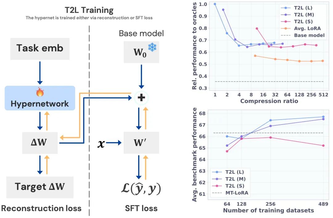 T2L能够实现高效的参数压缩,可以极大地减少存储需求,帮助LLM在资源受限环境中进行部署。
