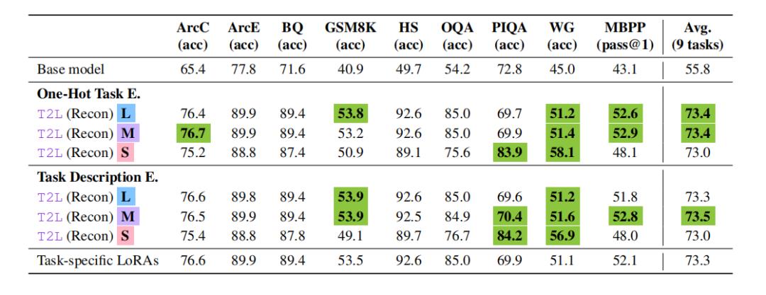 通过设置9个不同的NLP任务,将一一对应的LoRA适配器参数压缩为文本描述的嵌入向量,并通过3种T2L变体分别重建LoRA参数。